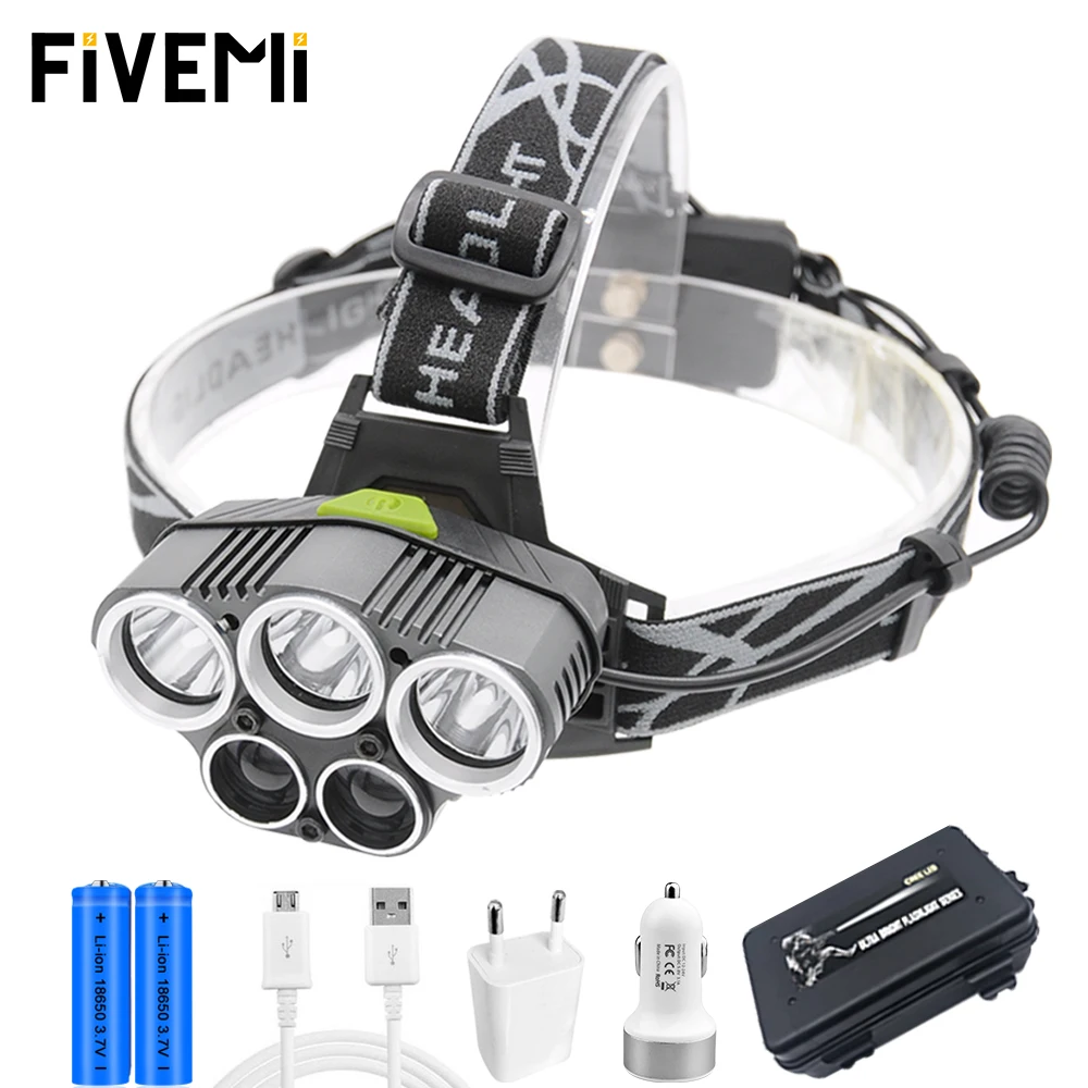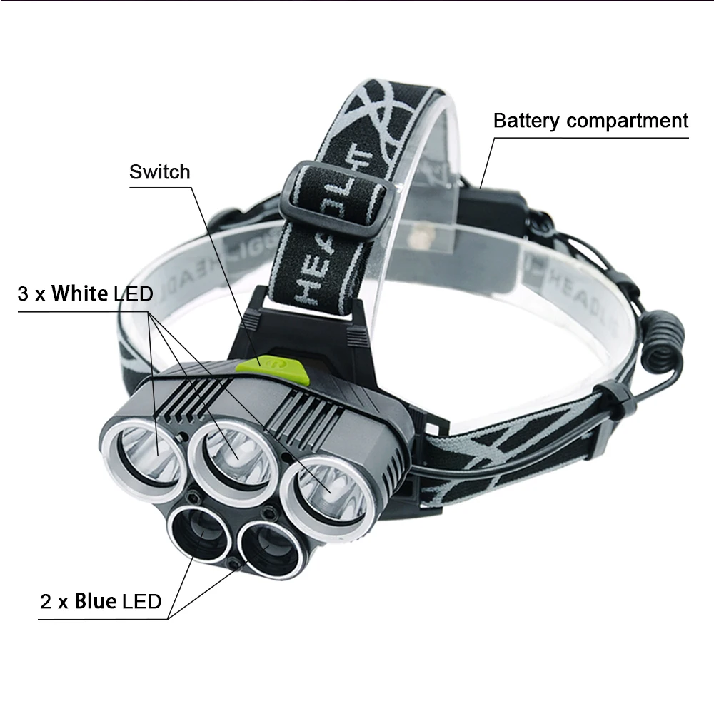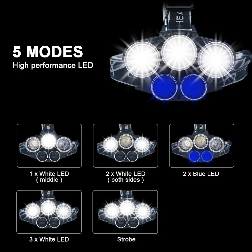 Related Product for USB rechargeable LED Headlamp 3 white + 2 bule light waterproof led headlight fishing lamp use 1865